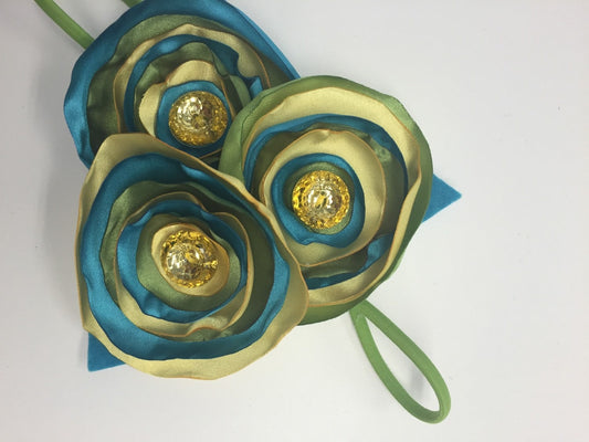 Turquoise, Apple Green and Lemon Yellow Silk Burned Edges Flower Headband
