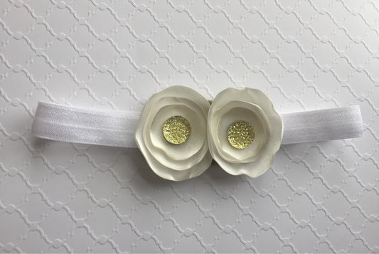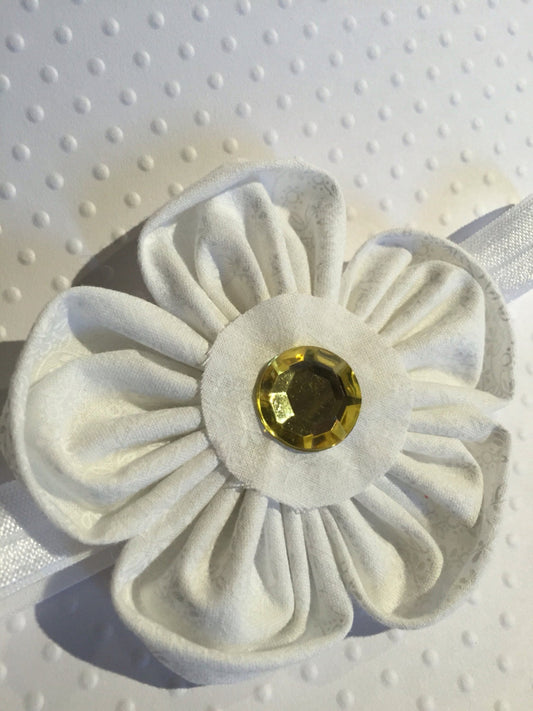 White Satin Burned Edges Two Flower Headband with Yellow Rhinestones